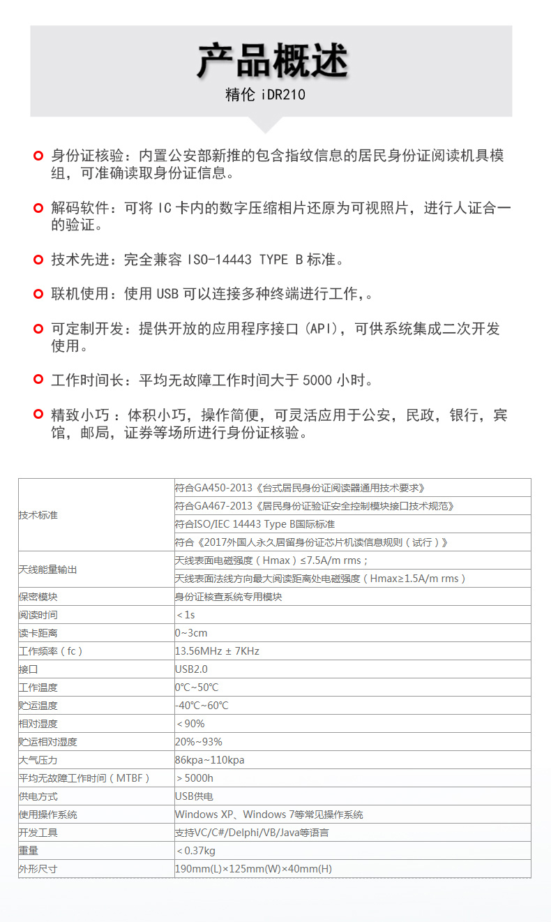 (*由于產(chǎn)品升級或其他原因,精倫IDR210身份證閱讀器產(chǎn)品實(shí)際參數(shù)有可能變更,以實(shí)際產(chǎn)品為準(zhǔn)。本文中的所有陳述、信息和建議也不構(gòu)成任何明示或暗示的擔(dān)保)